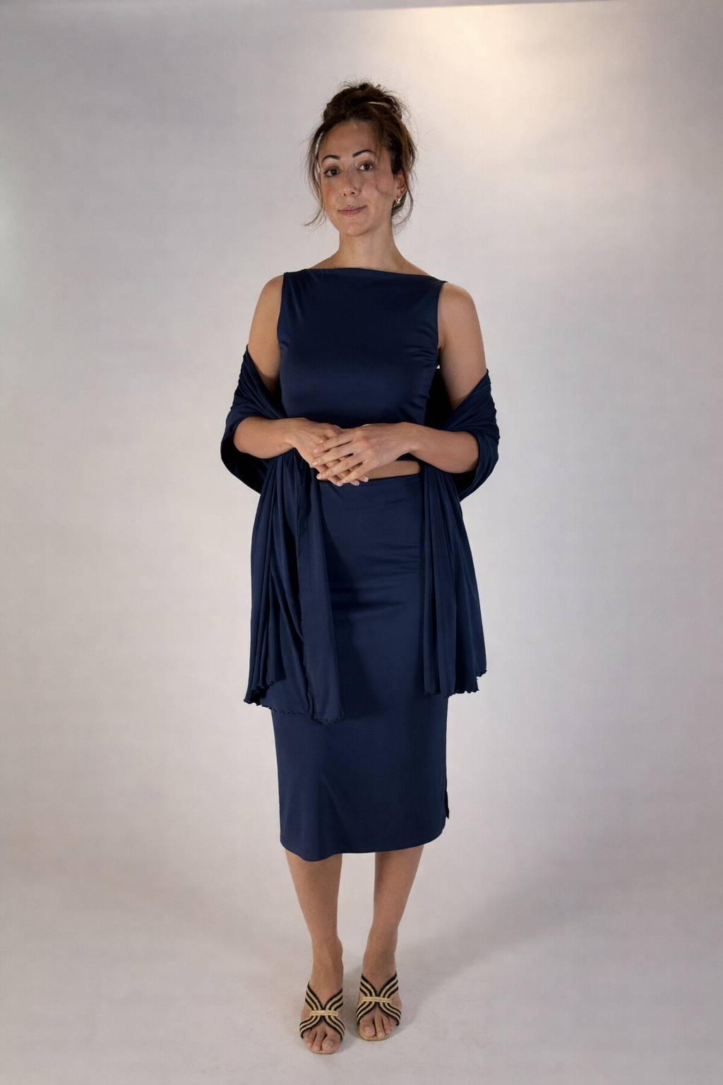 The Coco Tank is the foundation of a travel-ready wardrobe. Invisible hems for a seamless look, sculpting, and versatile. It can be worn two ways: with a low, soft square neckline in front for a more casual style that still feels elegant or reversed for a higher neckline - refined and polished.